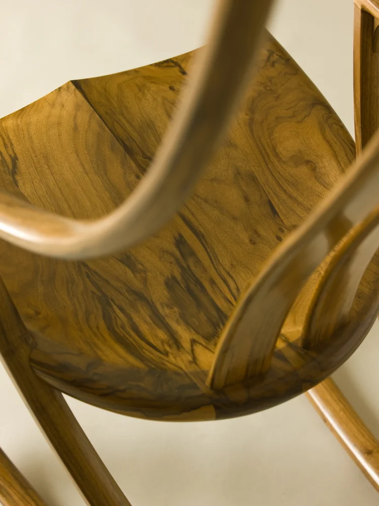 It is one of the most forgiving and pleasant woods to work, yet the most challenging in terms of choosing and combining the individual parts, as it is highly variable in colour and grain. No two trees are ever the same so all parts of a chair in English walnut must be from the same tree.